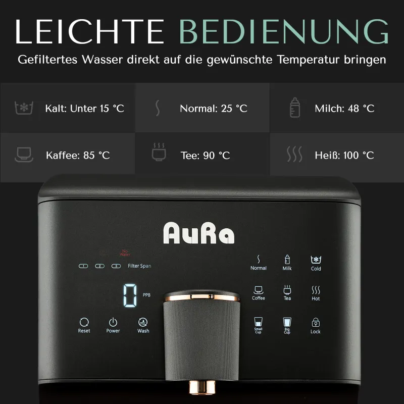 | Temperatur des Ausgabeproduktes | 1. gefiltert, 10 °C kalt 2. gefiltert, raumtemperiert 3. gefiltert, 45 °C heiß – perfekt für Milchpulver (Babymilch) 4. gefiltert, 80 °C heiß – perfekt für Tee 5. gefiltert, 90 ° C heiß – perfekt für Kaffee 6. gefiltert, 100 °C heiß |