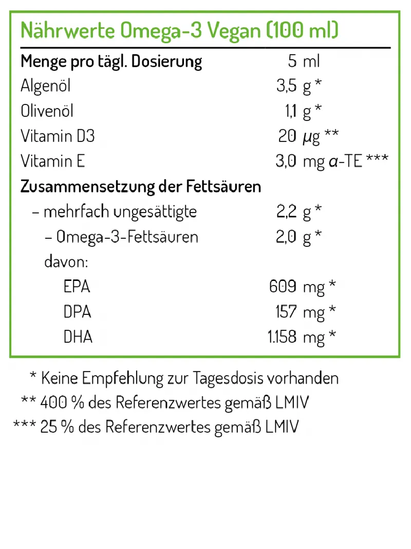Die empfohlene Tagesdosis beträgt 1 Teelöffel. Für eine optimale Aufnahme im Körper wird empfohlen, das Öl in Verbindung mit (oder direkt nach) einer Mahlzeit einzunehmen. Mit der empfohlenen Dosis reicht die Flasche für 25 Tage. Die empfohlene Tagesdosis sollte nicht überschritten werden, es sei denn, Ihr Arzt verordnet etwas anderes.